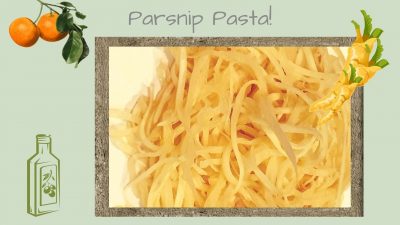 Peel your parsnip, then run your peeler up and down the parsnip in one motion, not lifting the peeler off the parsnip. If you have variegated blade or spiralizer, use that. You’re after think strips that resemble pasta. Gently toss in a bowl with a little olive oil, just enough to lightly coat it. You do not want it dripping in oil.